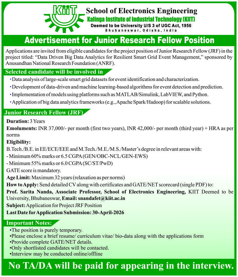 Junior Research Fellow School of Electronics Engineering – KIIT 24/04/2026 admin Junior Research Fellow School of Electronics Engineering – KIIT